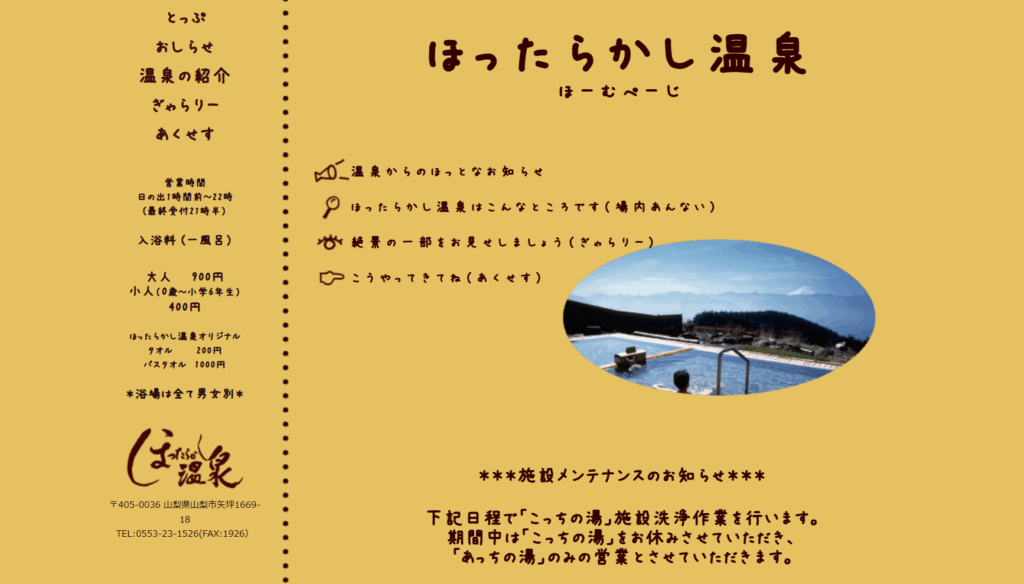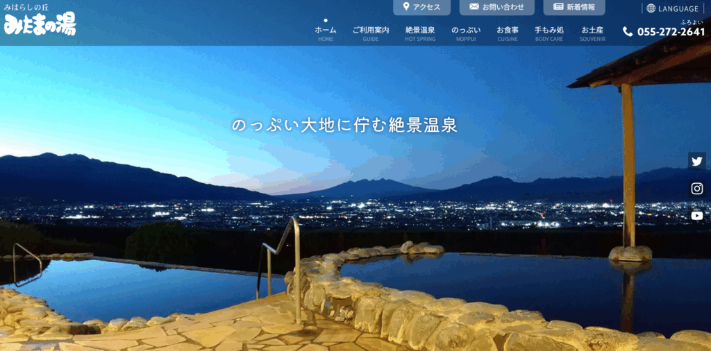 甲府盆地を望む露天が看板。夜はきらめく夜景が視界いっぱいに広がり、星の瞬きと重なる冬は特に印象的です。館内にはリクライニング系の休憩もあり、温冷サイクルをゆっくり組みやすい環境です。